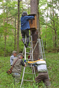 このような場合、フクロウが安心して子育てできそうな所に巣箱の位置を移動して再設置します。 |
