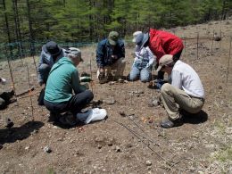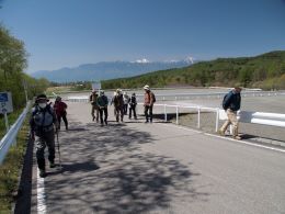 申し分のない好天。まきば公園内の舗装道路をゆっくりと登っていく。資材は助っ人のお陰で既に荷揚げ済みだったので、各人は作業道具だ け持てばよく、楽をさせていただいた。咲き始めたアオナシをゆっくり眺めることができた。木による個体差だろうか、別種のようにも見えた 道沿いの2本の木。田中先生によると、どちらもアオナシとのことだった。 いよいよ柵沿いの、道ではないところを歩く。シカがよく通るらしく、ヤブ漕ぎというほどでもないが、ずっと上り。多少喘ぎながら、1時 間ほどでオキナグサ保護地に着いた。 4月19日の下見の時、オキナグサはすでに咲き始めていて、5月1日の荷揚げの時もかなりの数が咲いていたので、花は終わっているので はないかと心配したが、まだ咲いているもの、蕾のものもあり、オキナグサは意外と花期が長いのかもしれないと思った。 手分けをして、最も効率の良いところを選んで、1m×1mのメッシュ15枚を設置した。シカの侵入を阻止できることを期待。 昼食の後、田中先生にヤツガタケトウヒを案内していただいた。絶滅が危惧される貴重な樹木。遠くからでも分かる美しい樹形をしている。 帰路、朝よりも開いたのではないかと思われるアオナシをもう一度眺めた。アオナシ越しの北岳など、山々は午後になってもよく見えた。 手伝ってくださる方がいて、保護柵強化を無事終えることができた。ありがとうございました。 |