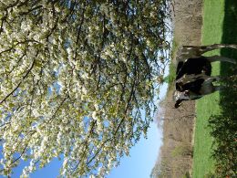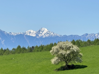 気持ちよく晴れた青空の下、12名が集まった。牧場内の緩い上り坂の舗装路を上がる。 所々のアオナシも見頃。放牧が始まったばかりの牛が寄ってくる。 オキナグサ自生地にはオキナグサが多くの花をつけていた。以前保護柵を設置したメッシュで覆われているところが最もよく咲いている。 空気が乾いているのか、帰り道でも山々はきれいに見えていた。気持ちよく保護活動を終えることができた。 |