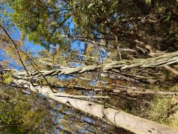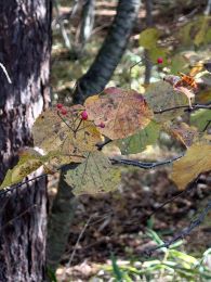 晴天で穏やかな小春日和となりました。暖かい日が続いているため紅葉も10日程度遅れているそうです。 9時にこぶちざわ道の駅に集合し、乗合で棒道火の見櫓後まで移動後、 途中開けた場所には大木となったフジの群生があり、足元にはアケボノスミレの葉、エイザンスミレとヒゴスミレのハーフと思われる葉を確認しました 11時半、火の見櫓で井澤さんから「晩秋から冬の樹木観察の楽しみ」についての説明を受けた後、再度乗合でこぶちざわ道の駅にもどり解散となりました |