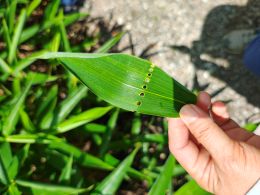 | 遊歩道にはシモツケなどが咲いていた | ミシン目のような正確な穴 笹がまだ丸まっている頃に虫に穴をあけられたため |