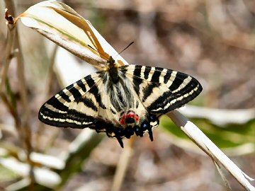 翅の斑紋はアゲハチョウに似ていますが、ふた周りほど小形です。スミレやカタクリの蜜を吸いに訪れます。この春の使者は不思議な習性をもっており、雄は交尾後雌の腹端に分泌物を出して貞操帯をつくり、雌は一度の交尾で貞淑な生涯を終えます。そのためか、またの名を『春の女神』と呼ばれています。