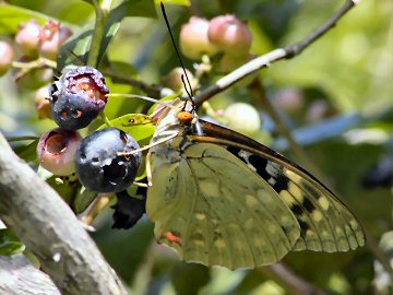 甘いフルーツは好きらしく、ブルーベリー畑でも樹液を吸いに来ている姿を見かけることがあります。オオムラサキの寿命は、普通一年と言われています。成虫になったオオムラサキですが、八ヶ岳南麓でも7月から8月に飛んでいる姿を見ることが出来ます。