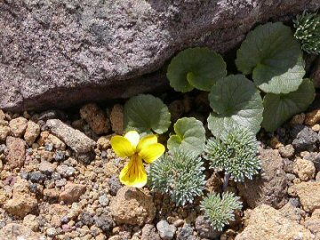 ヤツガタケキスミレは、八ヶ岳の高山帯の砂礫地に生えるスミレです。日本のスミレの中でも高所に分布。 以前はタカネスミレとされていましたが、葉の表面に光沢が無く、葉の両面脈上に毛があることから別種とされた。タカネスミレの亜種で八ヶ岳特産。キバナノコマノツメと間違えやすい。他の植物が生えない様なところに群生する。(撮影・市川富美子)