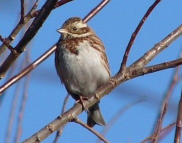 カシラダカは小さな身体で遠くシベリアの方から渡って来るホオジロ科の冬鳥です。大きさや羽の色、集団を作ることなどスズメに似ています。漢字で頭高と書くように頭に短い冠羽があり、緊張した時に立つようです。眼の上と首筋の白く太い線(ときに黄色く光ってみえる)が目立つ程度で色、形、声ともに地味な鳥です。