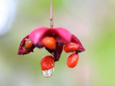 日本全国に分布する落葉低木。花や実が垂れ下がっているので、この名がある。葉は対生で葉腋から長さ10cm前後の長い柄を出し、その先に直径6~7mmの淡緑色または淡い紫色をおびた小さな花をたくさん咲かせる。花弁は5枚。果実は1cmくらいの球形で 秋に熟すと五つに割れ、中から仮種子に包まれた赤い種子が吊り下がる。名の通りで可愛らしい。また 葉の紅葉も美しい。材はコケシ、印材、寄木細工などに利用されるという。同じニシキギ科にマユミがあり、よく似ているが、マユミの実は四つに割れるところが大きく異なる。(撮影:俵 一雄)