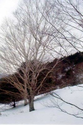 亜高山帯に分布する岳樺は、地味な樹であるが厳しい自然環境下でもその生命力を見せつけてくれるつわものでもある。岳樺には雪が似合う。薄肌色の樹皮がほんのりとした温かさを感じさせつつ夕日を浴びて雪原に凛然と立つ姿の美しさは真に感動的である。