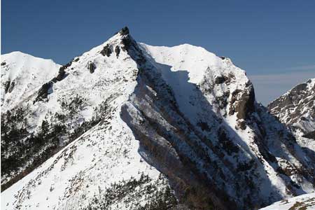 前三ツ頭直下は厳しい急坂の連続、前爪をしっかり蹴り込み前進します。 稜線では雪煙舞い上がり強い向かい風となります。三ツ頭でストックをピッケルに取り替える。 途中、誰とも出会うこと無く、トレースは風で消え、一人でラッセルしつつ山頂目指す。 頂上直下の岩峰を廻り込む、この僅かな距離が最も危険な場所で、 雪の状態、体のバランス等全神経を集中し慎重に行動します。