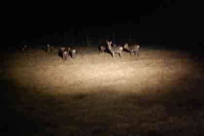 ライトセンサスとは、夜間にサーチライトを照らして、野生動物の生態を観察する手法です。 闇の牧場をサーッと照らすと、シカの眼が光ります。 それを数えて頭数を記録して行きます。お尻のハートマークでも数えます。
