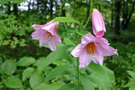 オトメユリ(乙女百合)とも呼ばれる日本特産のユリです。花はピンク色で、優しい感じの花です。 横向きに半開きになって咲きます。ヤマユリほどではありませんが、花の香りは甘くとても濃厚です。