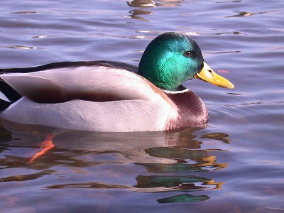 写真は緑色の頭が目立つマガモの雄です。 厳冬期、小さな池は結氷してしまいます。近くのため池でカモウォッチングしてみませんか。
