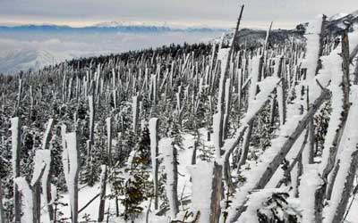 山頂の稜線からは縞枯れ現象が良く分かる。 積雪期には木々にエビの尻尾と呼ばれる樹氷が取りついてモノトーンの特異な風景を見せてくれる。