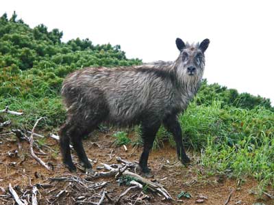 雨上がりの稜線を歩いていると、大きなニホンカモシカ(以下カモシカ)が谷からノッソ、ノッソと登って来た。 白毛が目立ち、そのうえ雨に濡れているのでかなりの高齢であるように見受けられたが、 這松を背にしたその姿にはなんとも言えない風格があった。