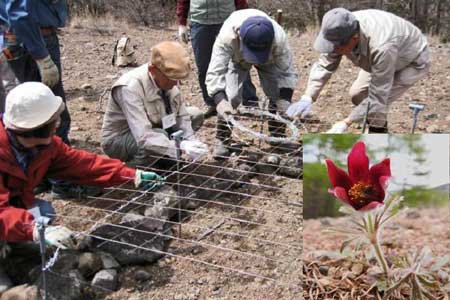 このオキナグサが減ってきている。原因は、「ヒト」による盗掘が主であったが、 近年は「シカ」による食害が多い。キンポウゲ科の有毒植物であるにも拘らずである。