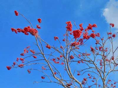 真冬の青空に、真っ赤なナナカマドの実が目を引きます。初夏に白い小花が房状に咲き、5~6ミリの実に成長。冬の間、野鳥には大事な食糧です。