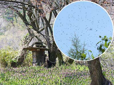 時には、散策中の頭上で聞こえるウォーンという大きな音に驚かされるかもしれません。 新居へ引っ越し途中のミツバチの群れで“蜂雲”と呼ばれています。