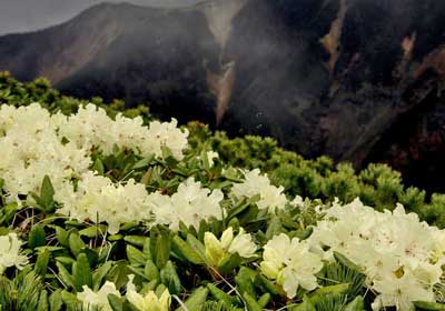 梅雨の晴れ間に硫黄山荘から横岳への稜線を登って行くとハイマツ帯の中に白い花が見え始め、 近づくと薄いクリーム色の清楚な花の群落が現れました。ハイマツと共生するかのように咲く群落はキバナシャクナゲでした。
