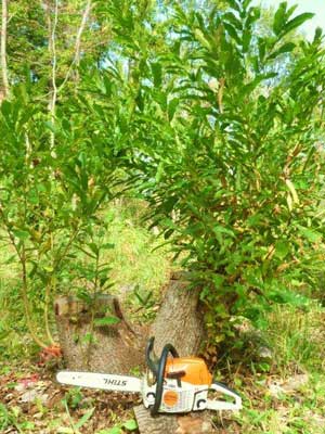 写真は1年生の萌芽とチェンソー。(文・写真 佐波義友)