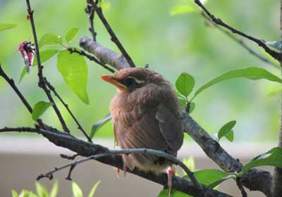 昨年我が家の玄関のテイカカズラの中に巣を作り、5月中旬に2羽が巣立ちました。写真は巣立ちの日のものです。 巣から出たものの、どうやって羽ばたけば良いのか思案しているのでしょうか?